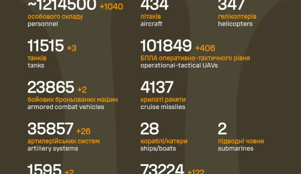 Втрати російських окупантів у війні проти України 7 січня сягнули 1 214 500 осіб. За минулу добу ЗСУ ліквідувати ще 1 040 окупантів, повідомляє Генеральний штаб ЗСУ. “Дані уточнюють”, – зазначили в повідомленні. ЧИТАЙТЕ...