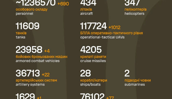 За останню добу росіяни втратили на фронті ще 690 солдатів. Також Сили оборони України знищили 22 артсистеми, 899 дронів, 77 одиниць автотехніки і не тільки, повідомляє Генеральний штаб ЗСУ. “Дані уточнюються”, – сказано в...